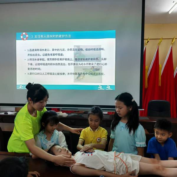“当有人落水后,把救生圈用力抛向落水者上游方向,水流会把它带到他们身边。”志愿者边讲解边精准示范。孩子们围拢过来,屏息观察,眼中充满好奇与探索欲。在志愿者手把手的指导下,几位孩子鼓起勇气上台尝试,模拟落水者上岸后的施救方法。
