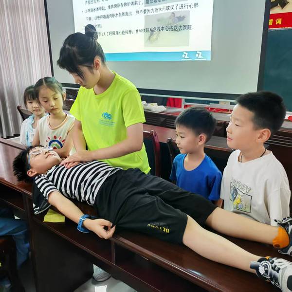 “假如小伙伴在水里遇到危险,我们该怎么做?”志愿者抛出关键问题。话音未落,一只只小手如林般举起。“要大声喊救命!”“快跑去找大人!”“千万不能自己跳下去救!”孩子们争相分享想法。志愿者在肯定正确回答的同时,清晰补充关键原则:“记住‘叫叫伸抛法’——大声呼救是‘叫’,立刻拨打110或120是第二个‘叫’,寻找长竿树枝‘伸’过去,或者将空水瓶绑在绳子上‘抛’给落水者,这才是最安全有效的帮助方式!”通过对比式讲解,科学的施救理念深深印入孩子们脑海。