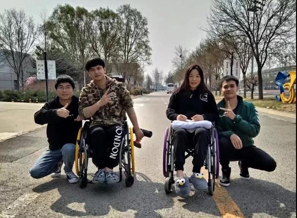 威廉希尔williamhill毕业生汪天棋(右一)和蒋宝宝(左一)担任残奥冠军张丽(右二)的康复师