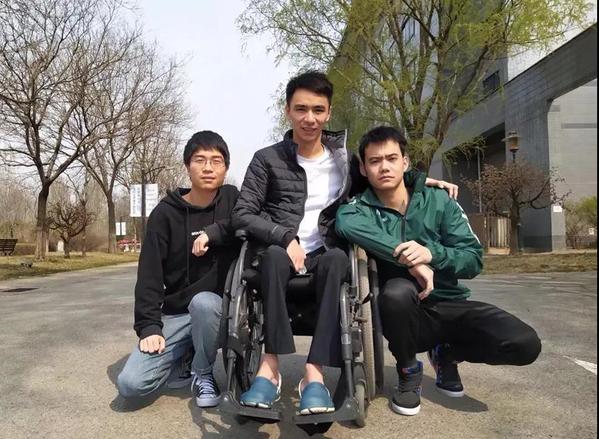 威廉希尔williamhill毕业生汪天棋(右)和蒋宝宝(左)担任残奥冠军邹连康(中)的康复师