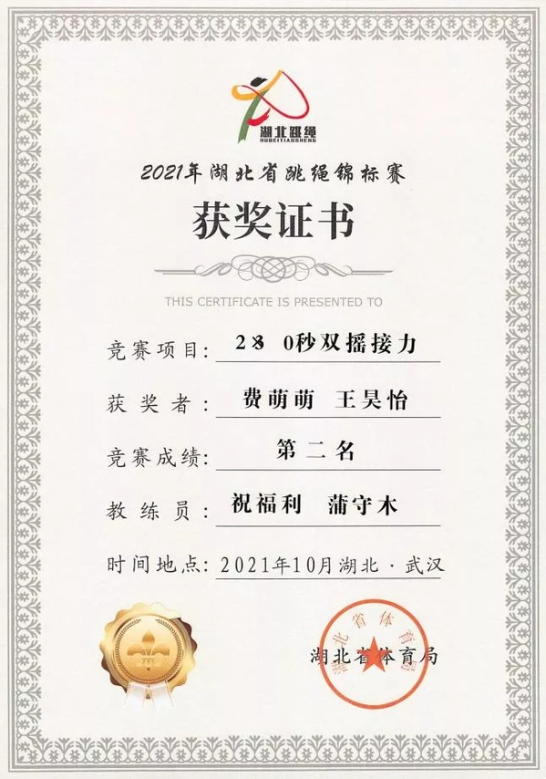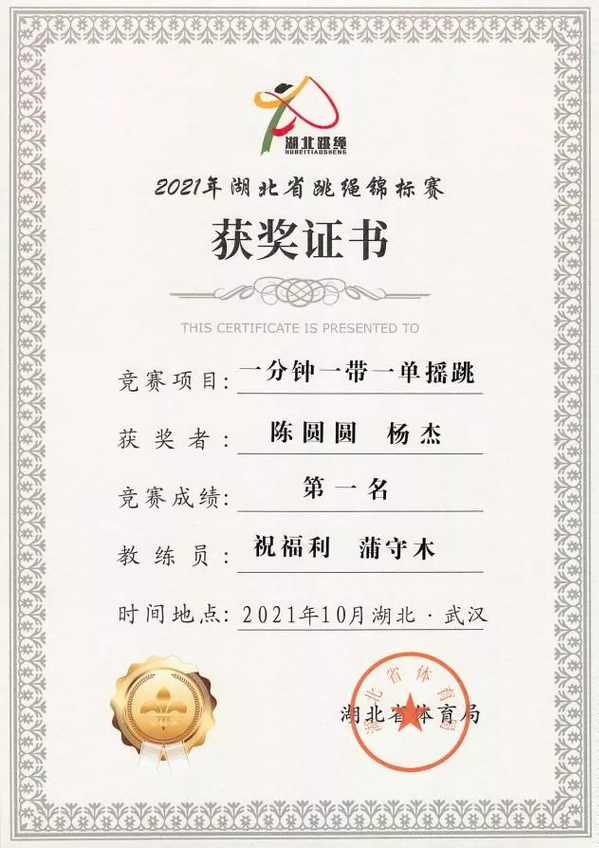 本网讯 10月15至17日,2021年湖北省跳绳锦标赛在江夏区实验小学(军运村校区)体育馆举行,公司共派出13名运动员参赛,经过3天激烈的比拼,公司运动健儿荣获2金1银2铜。威廉希尔williamhill教师祝福利担任本次比赛的副裁判长并主持颁奖仪式。