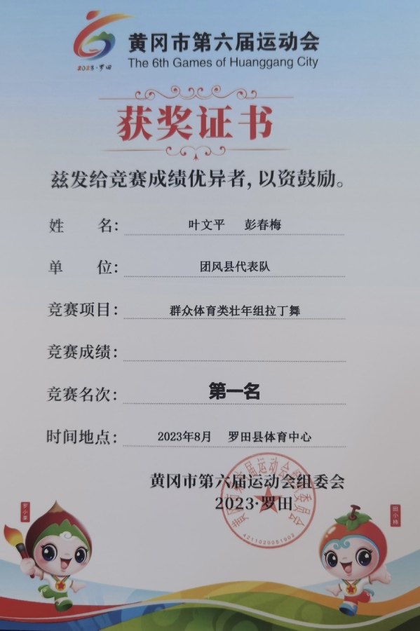 据悉,8月2-4日,叶文平和彭春梅两位教师代表团风县代表队参加黄冈市第六届运动会,获壮年组拉丁舞冠军。