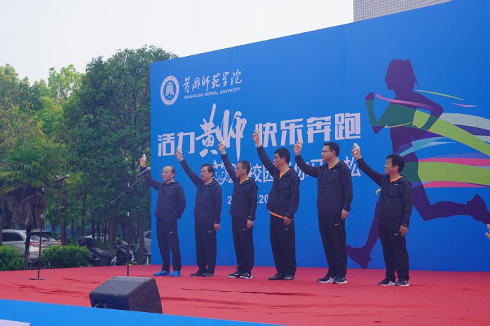 漆昌柱致辞。漆昌柱、陈朝阳、王基家、宋文生、夏庆利、汪晓凌为比赛鸣枪。校领导鸣枪后还参加了快乐跑组的比赛。