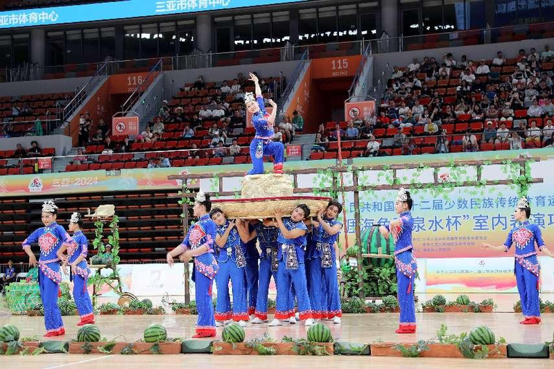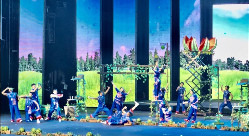 11月25日,在三亚体育中心,公司表演项目技巧类《顶瓜瓜》队伍,代表湖北省正式亮相本次运动会表演项目赛场。随着音乐的响起,运动场化身翠绿的丰收瓜田,小伙子们在炎炎夏日,用草帽在休息之余表演精湛技巧,使观众眼前一亮,又逗乐不已,姑娘们则利用双手和双脚上下翻腾,将摘下的西瓜越堆越高,配合默契,更是赢得满堂喝彩。